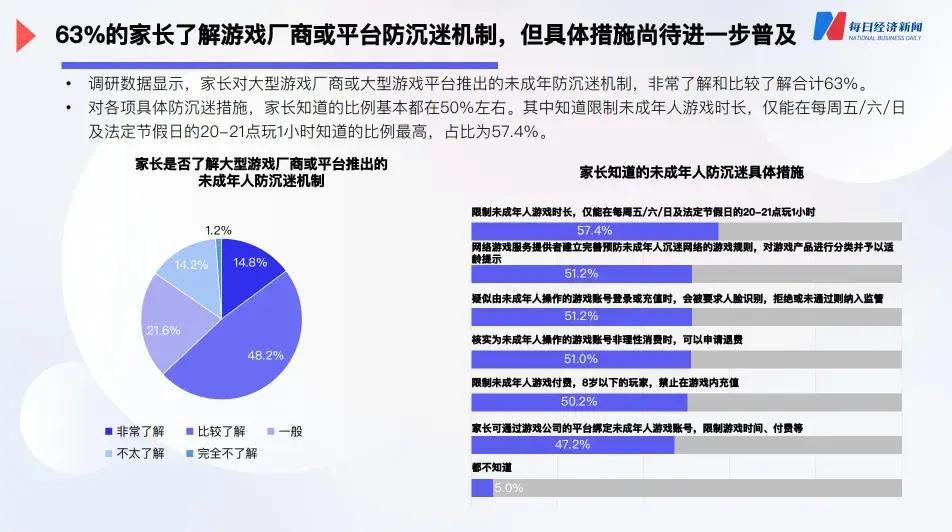 除此之外,即便家長有心管理孩子,遊戲廠商也提供了不少監護工具,但考慮到一些家長的年齡和他們對互聯網的認知程度,恐怕也只是有心無力。在調研報告中,對廠商所提供的防沉迷機制有所瞭解的家長僅佔比63%,而知曉各項工具具體使用方法、能夠自行操作的家長應無疑只會更少。