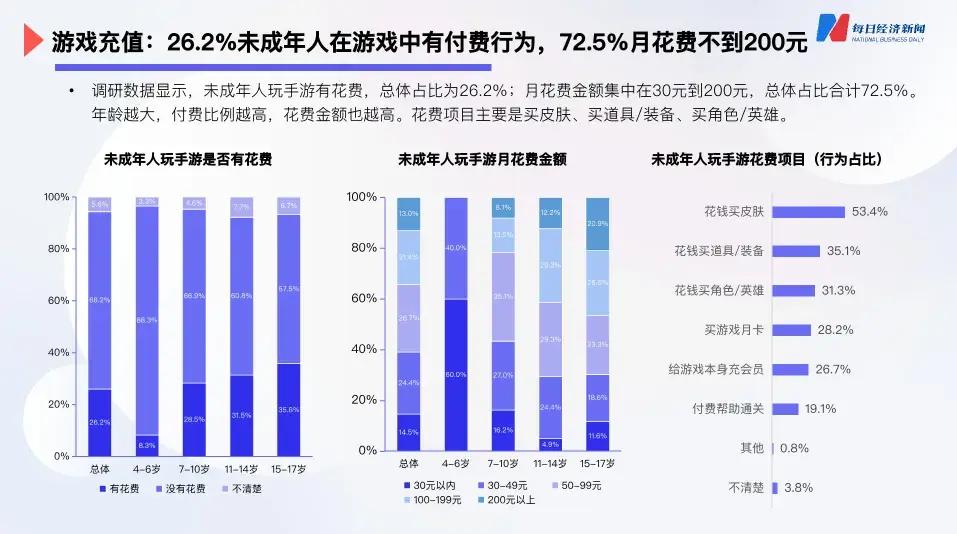 在充值方面,數據顯示玩手遊且在遊戲中有過消費的未成年人佔比爲26%,月消費金額集中在30元到200元。