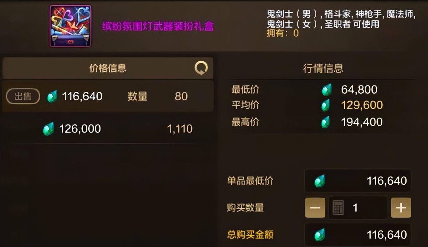 以目前最便宜的“氛圍燈武器裝扮”爲例,售價大概在12萬泰拉左右,然後賣給商店可換來2000萬金幣,此時兌換比例爲「1泰拉=170金幣」!
