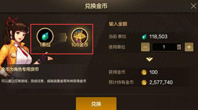 首先打開揹包,點擊金幣旁邊的“+”號,就可以直接用泰拉兌換金幣,此時的兌換比例爲「1泰拉=100金幣」!