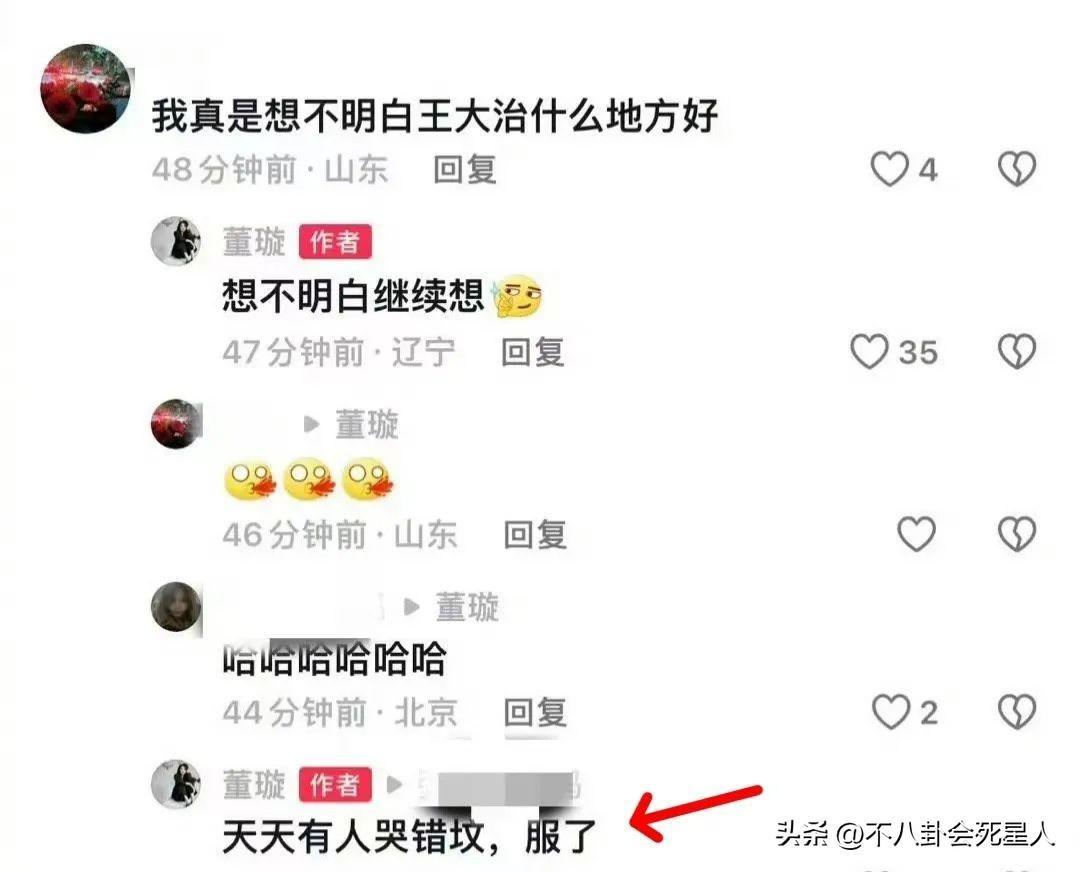 這事還鬧了烏龍,連累了董璇,董璇與董潔名字相似,有網友就此事給董璇留言,詢問王大治哪裏好,董璇無奈回覆,“天天有人哭錯墳,服了”。