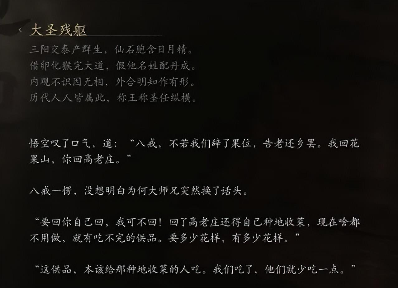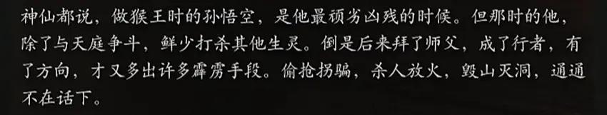 然而遊戲裏通過各種側寫來塑造的大聖,其形象卻多少偏離了大家的預期——這裏的悟空着重凸顯了“黑神話”的部分,難捨兒女情長,性情又有些反覆無常,實在是少了幾分大家期待的那種 “鬥戰勝佛”所應有的超然感。