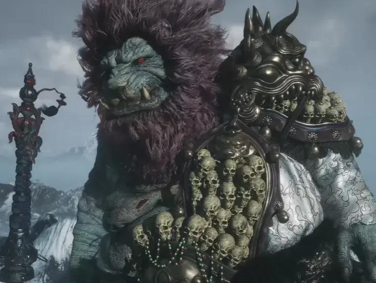 如果我們在讓想象力更天馬行空一些——說來在遊戲裏,當這二郎顯聖真君在與天命人的法天象地之戰中,化作了青臉獠牙的獅子形象,此時如果你仔細觀察他的建模,會發現這青面獅子身上纏繞着大量頭骨: