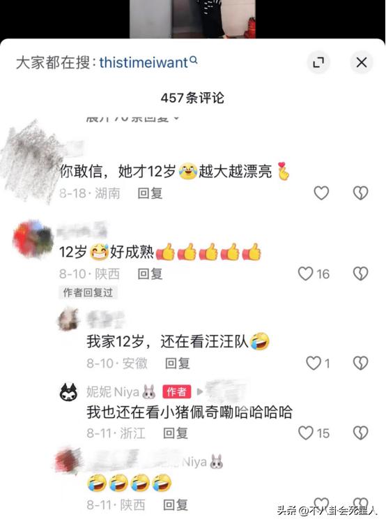 有網友質疑12歲的妮妮過於成熟,還有網友表示自己家12歲的孩子還在看汪汪隊,妮妮回覆道,“自己也還在看小豬佩奇勒”,幽默有趣地化解了一場“網絡批判”。此外,還有針對妮妮身材的討論,她都非常禮貌、真誠地回覆,“自己正在慢慢減,健康比較重要。”