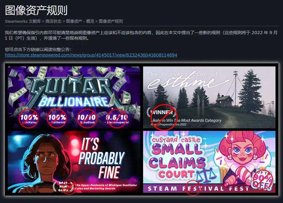 而根據Steamworks對開發者的要求,任何上傳到商店頁面的圖像資產都禁止帶有媒體評分、獲得獎項、成就數量,也不允許出現其它營銷文案。