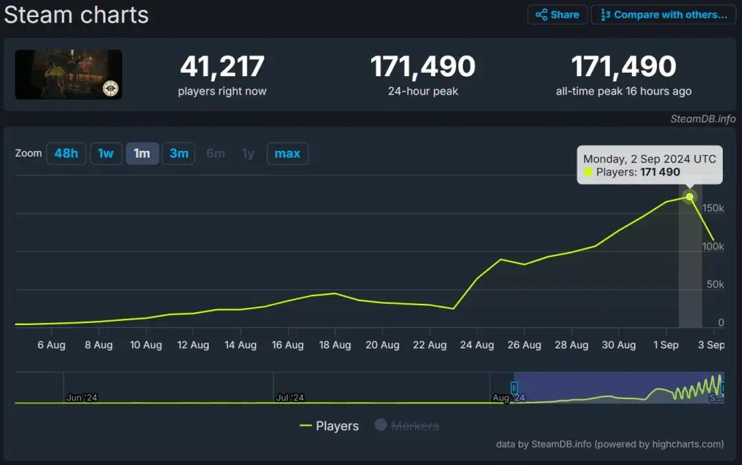 與此同時,遊戲的在線人數則是增漲顯著,突破了17萬,來到Steam當前在線人數榜的前20位置。