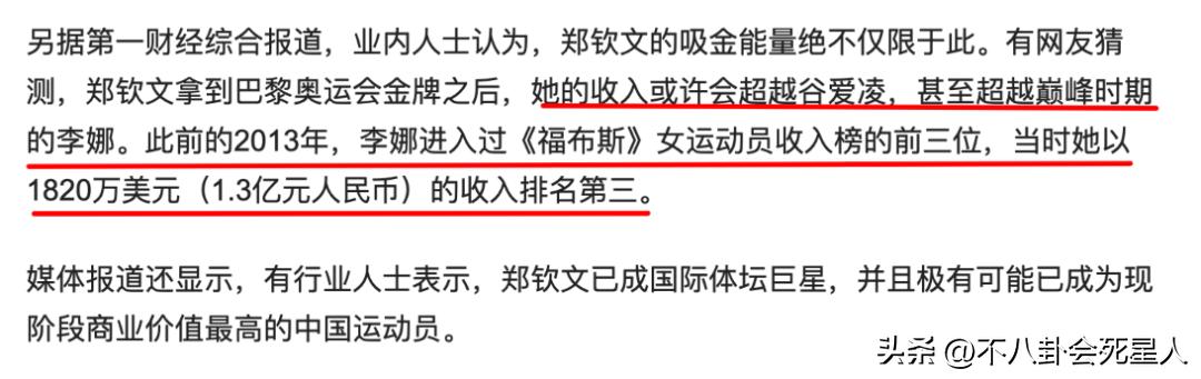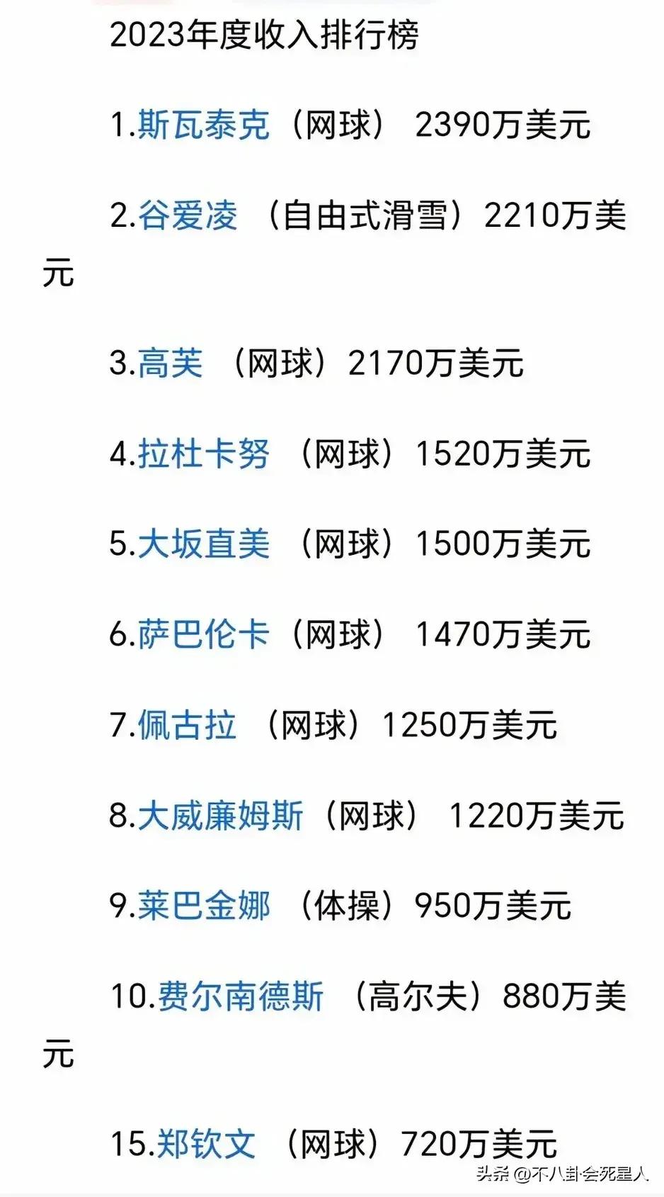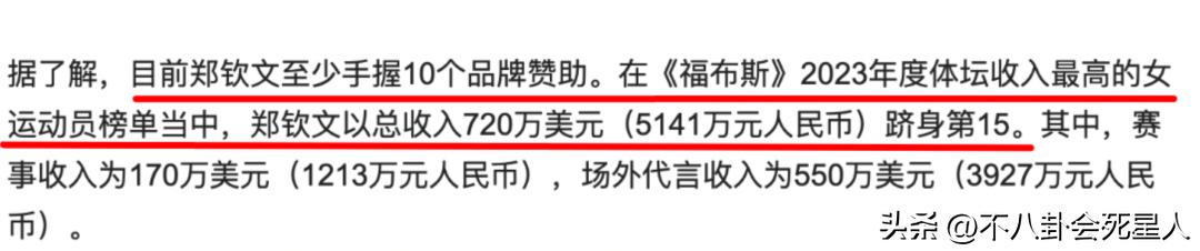 在獲得巴黎奧運會之前,鄭欽文在2023年的收入排在福布斯全球女運動員中是第15名,年收入是720萬美元,摺合人民幣已經超過5千萬。