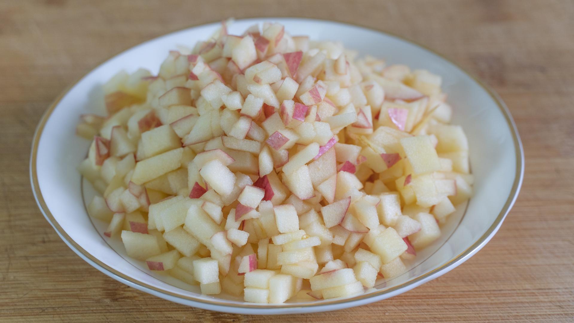 4、蘋果皮不用削,先將蘋果切片,然後再切成細絲。最後再切成小丁後裝入盤中備用。