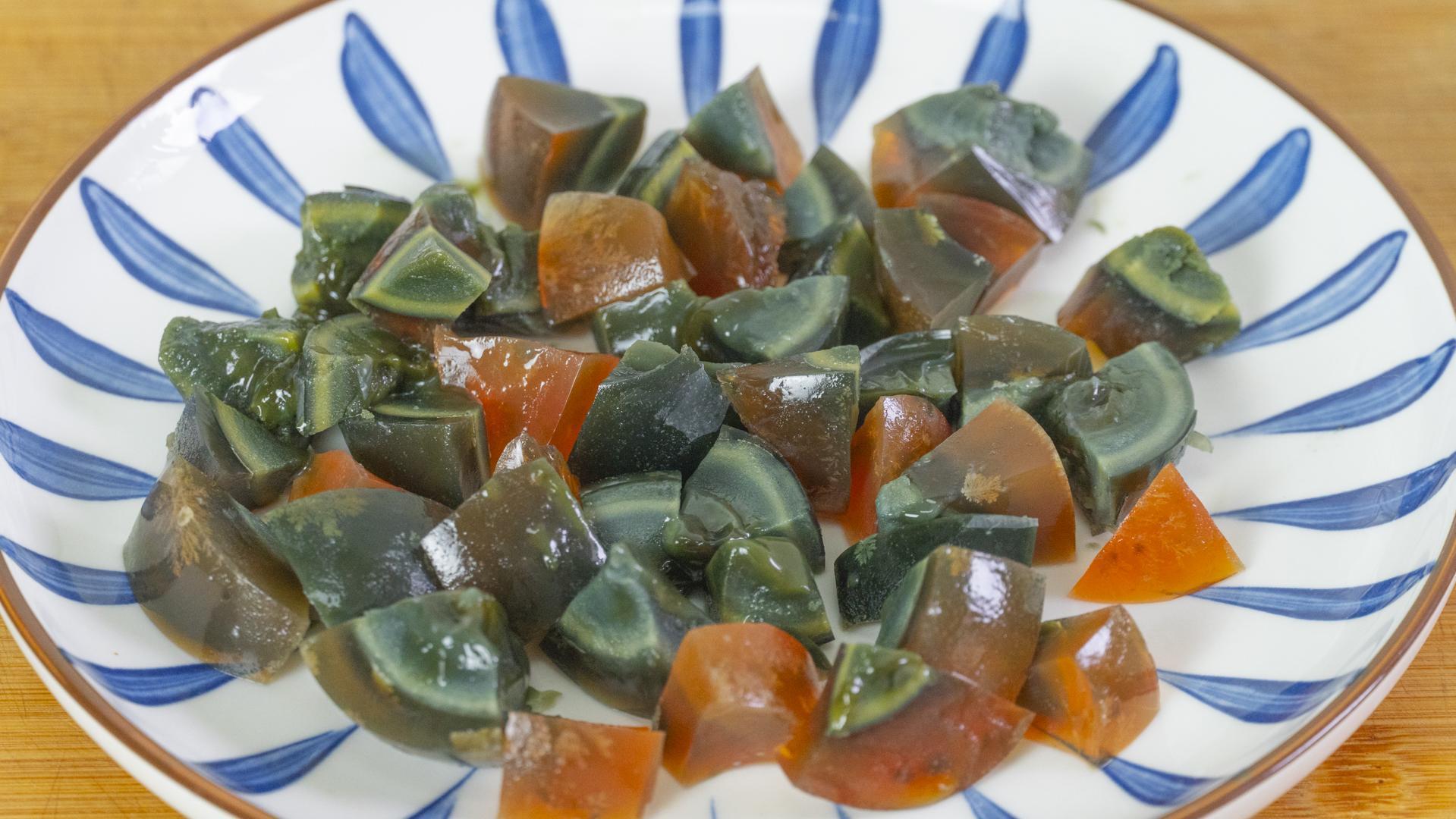 5、皮蛋1個,剝殼後先切成塊兒,再切成小丁,然後裝入碗裏備用。