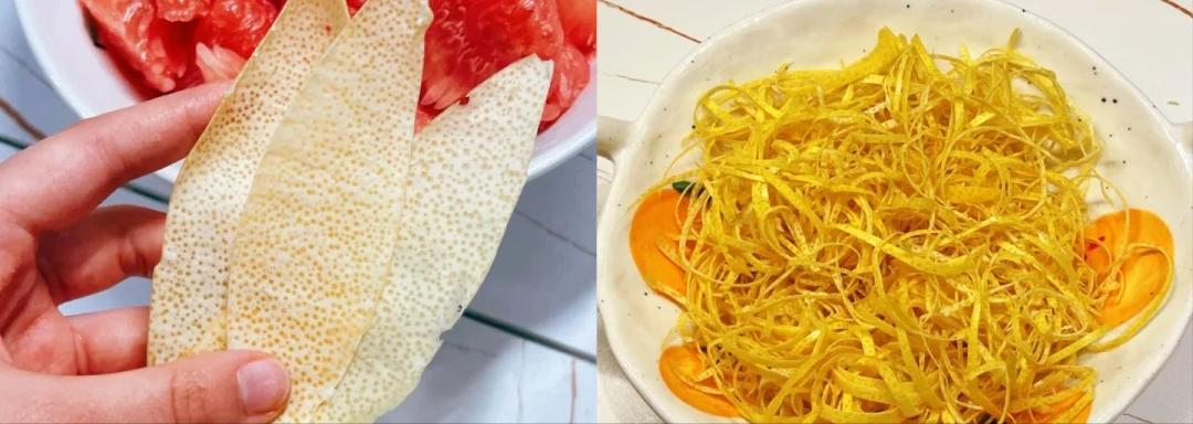 1、柚子用食鹽搓洗柚子表皮,然後柚子皮去白瓤,儘可能把所有的白瓤去掉,只留柚子表皮,這個是不苦的關鍵。