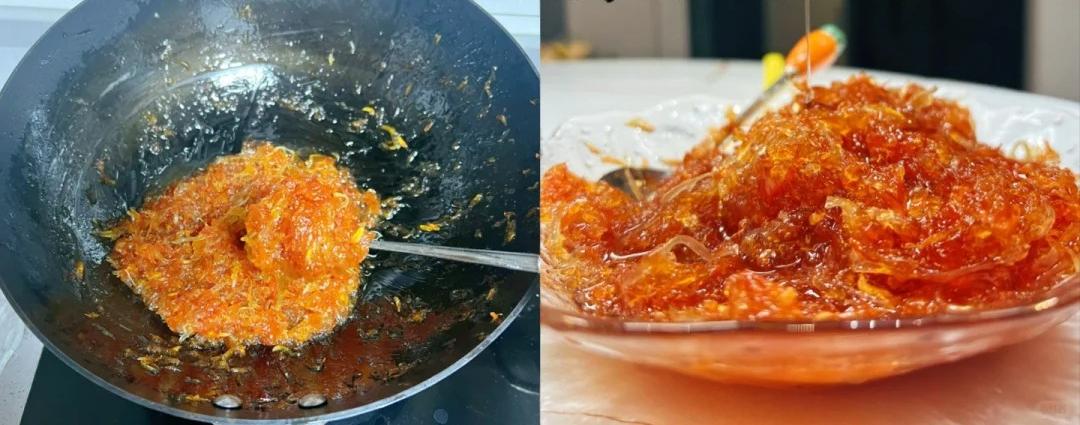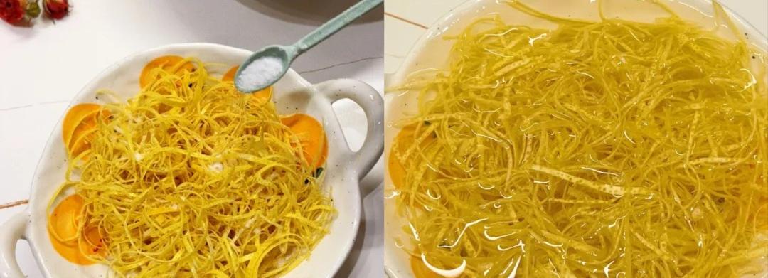 2、去瓤的柚子皮切細絲,放鹽抓出苦水,清洗乾淨後,再用鹽水浸泡一個小時。