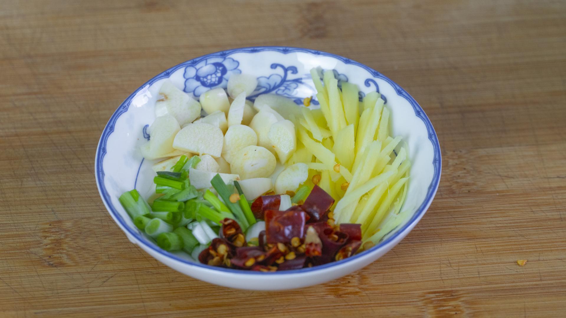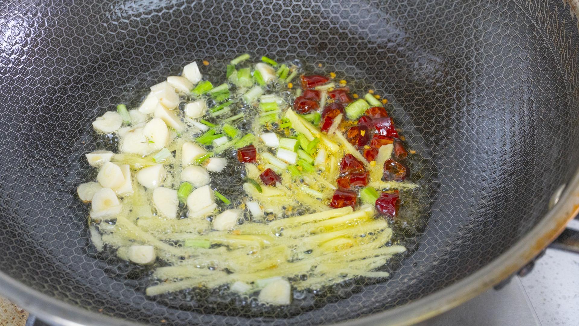 8、起鍋倒油,油熱下蔥、姜、蒜、幹辣椒爆香。