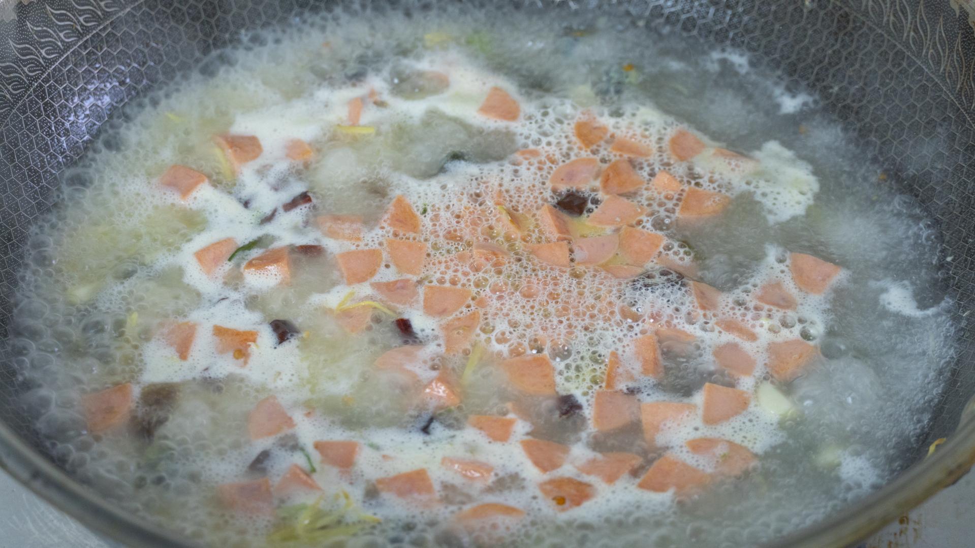 9、接着把皮蛋和火腿也倒進來,大火翻炒一分鐘,把皮蛋和火腿腸炒到有點焦焦的就可以了。接着倒入一大碗開水繼續煮開,調味加鹽、雞精、胡椒粉就可以。