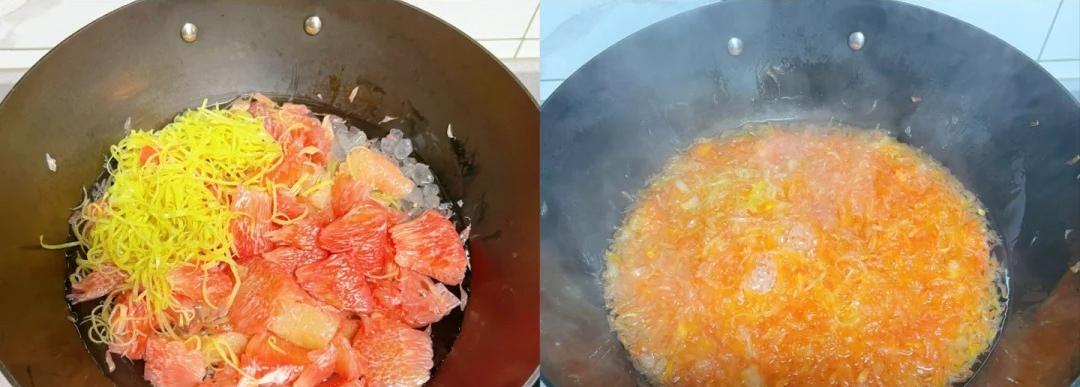 5、鍋中放入清水,白糖,柚子果肉和柚子皮,中大火燒開,改小火慢慢熬,熬至粘稠,放涼後加入蜂蜜。