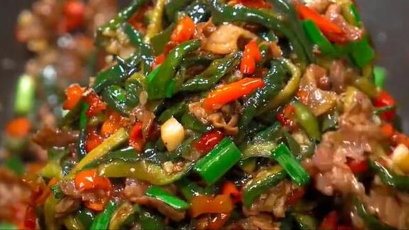 第十步:再切點五花肉,喜歡喫辣的就切點小米椒,然後下鍋炒就行。