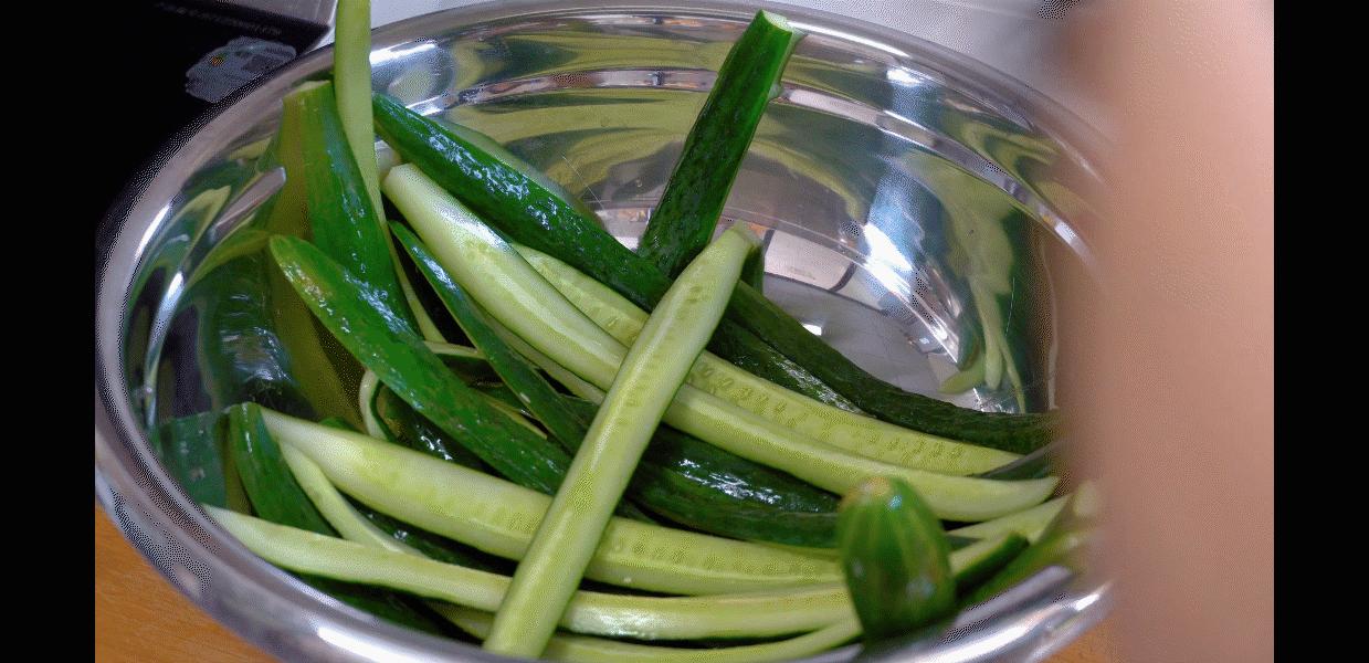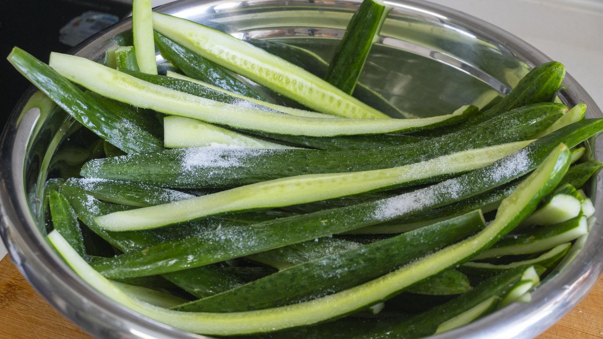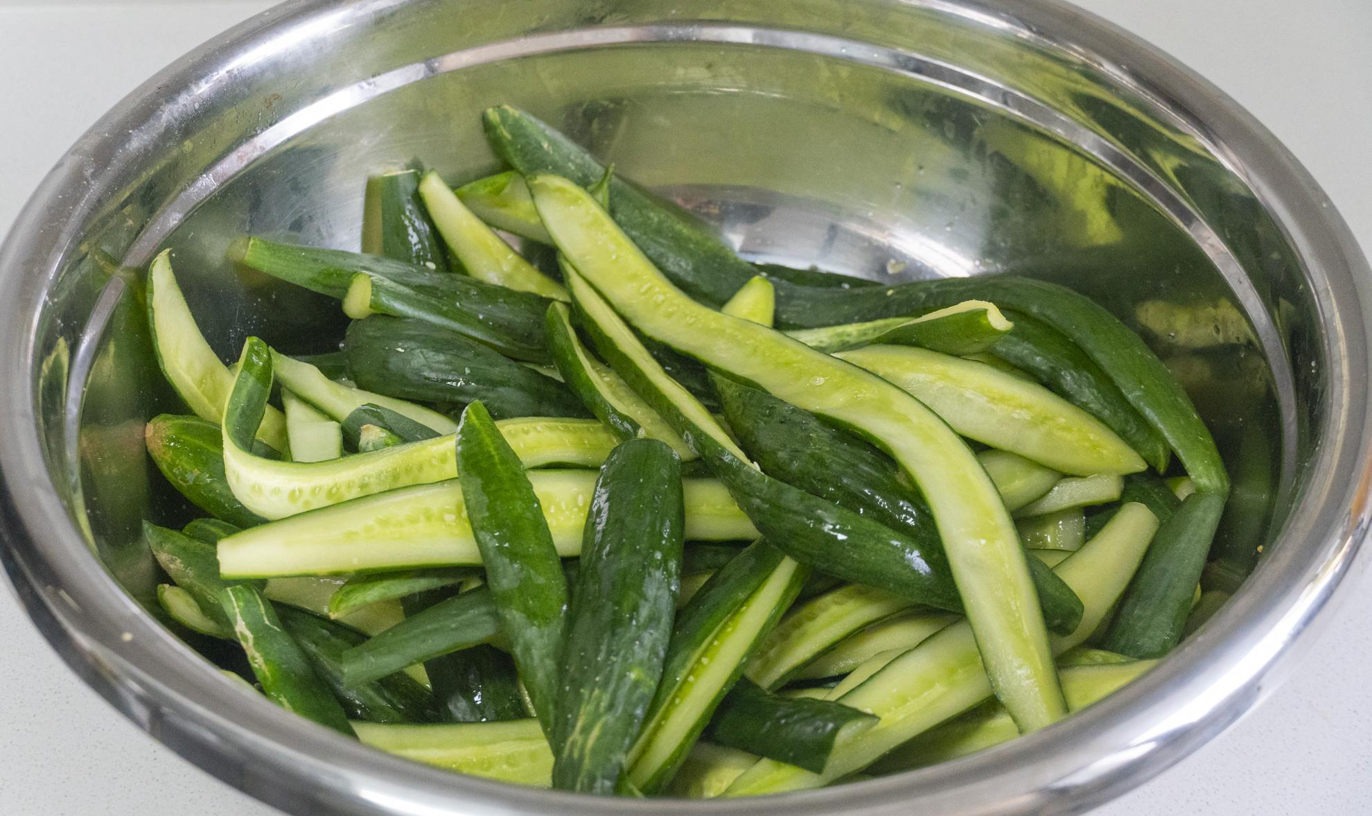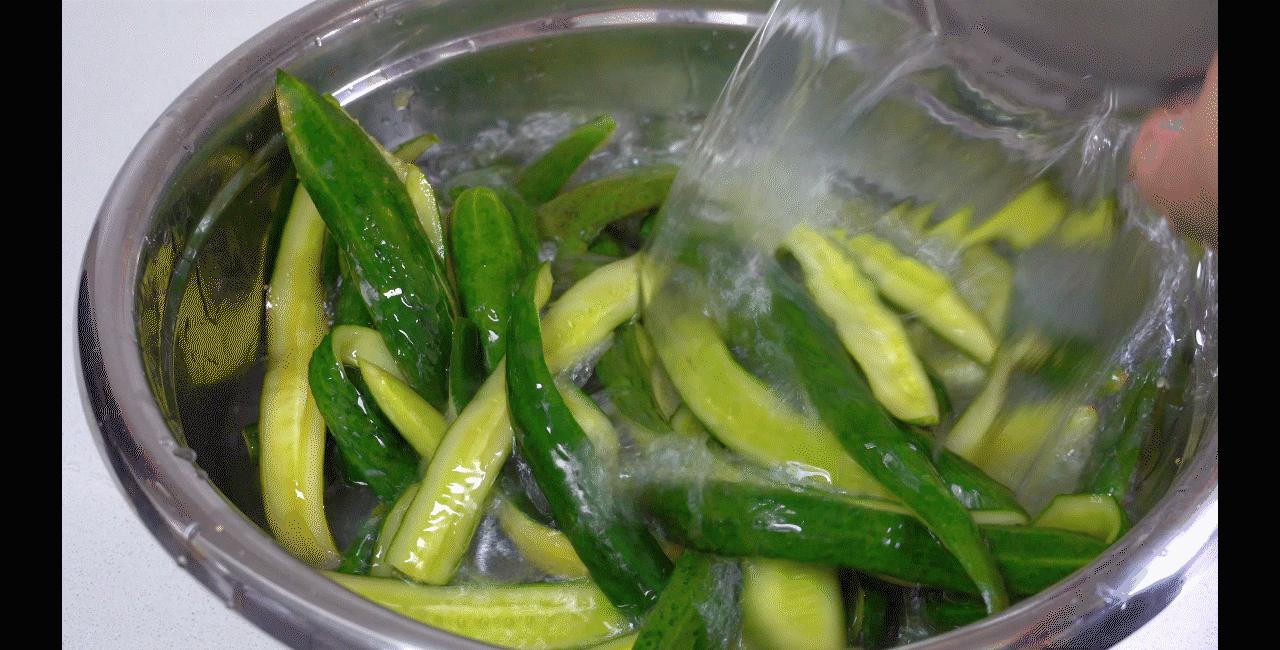 第六步:黃瓜醃好後加水沖洗兩遍,洗掉鹽,避免過於鹹。