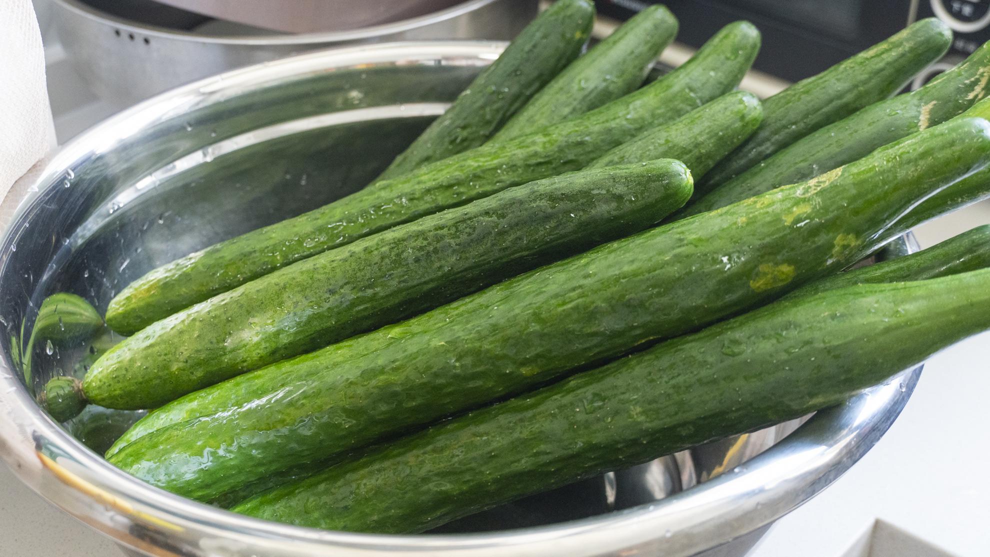 第一步:黃瓜10斤清洗洗乾淨。黃瓜的品種很多,其實都可以曬,只不過有的黃瓜瓤裏面多,方法都是一樣,曬出來的口感也都是一樣的,就算是本地黃瓜,也是一樣可以曬的。