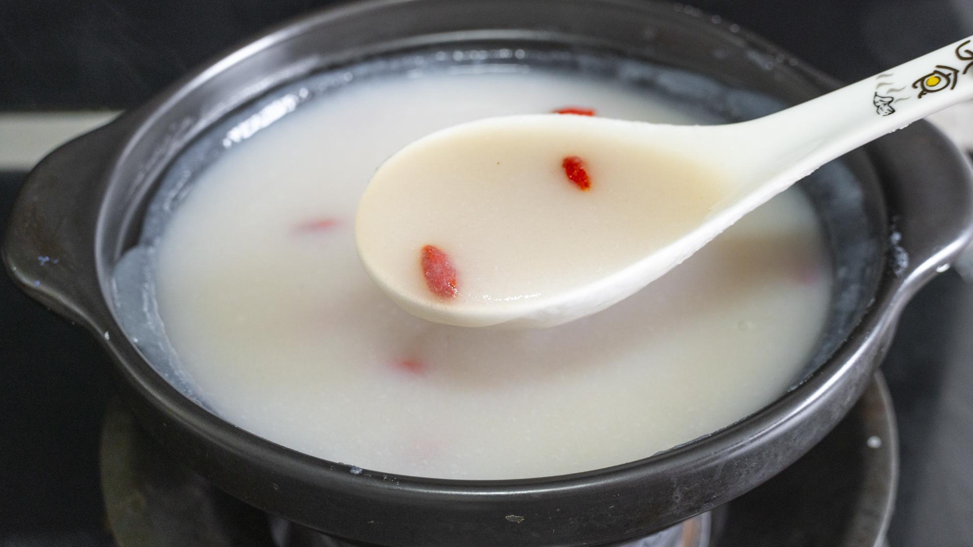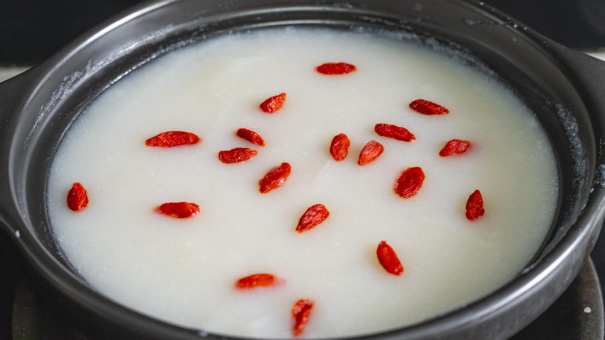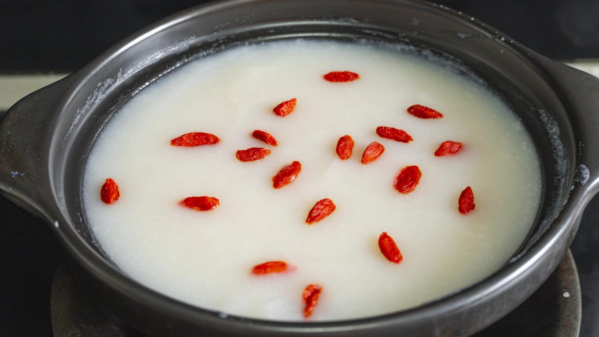 第六步:藕粉煮好了最後放點枸杞就可以關火了,直接舀碗裏就可以開喫了。煮一下後,藕漿的狀態瞬間就變成了藕粉,很濃稠的,和乾粉衝出來的味道差不多。