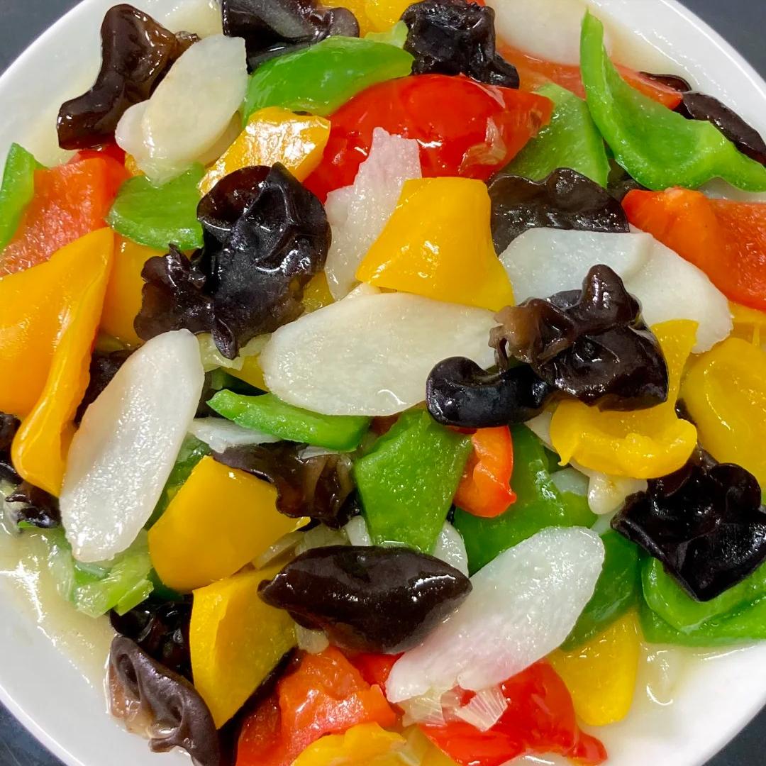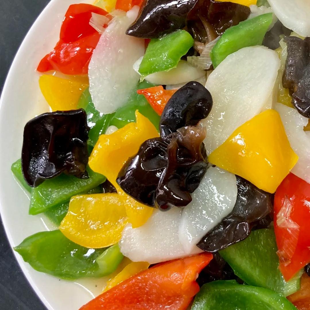 1、山藥一根,削皮切片;木耳一小把,加水泡發,然後清洗乾淨;青紅菜椒各一個,洗淨後去籽切塊。