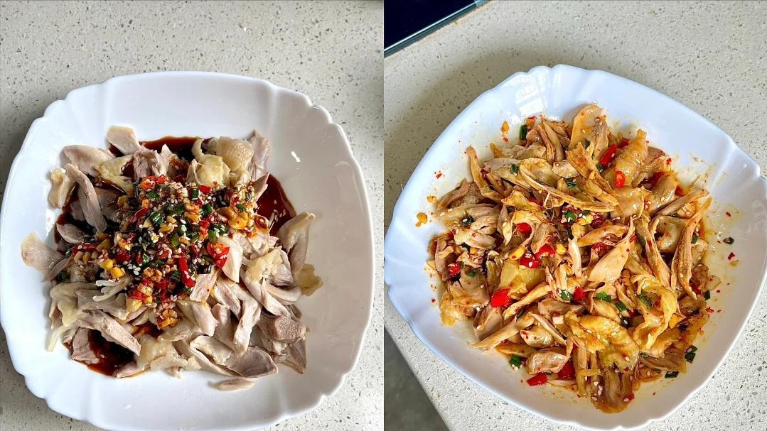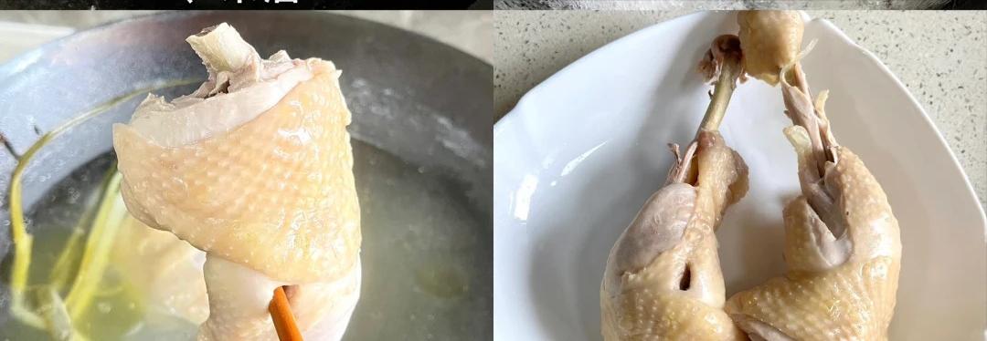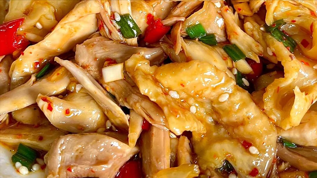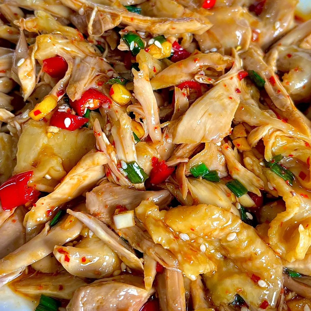1、雞腿冷水下鍋,加入蔥姜、米酒煮20分鐘,去掉浮沫,筷子能輕鬆穿透雞腿且沒有血水就撈出放涼,撕成條狀。