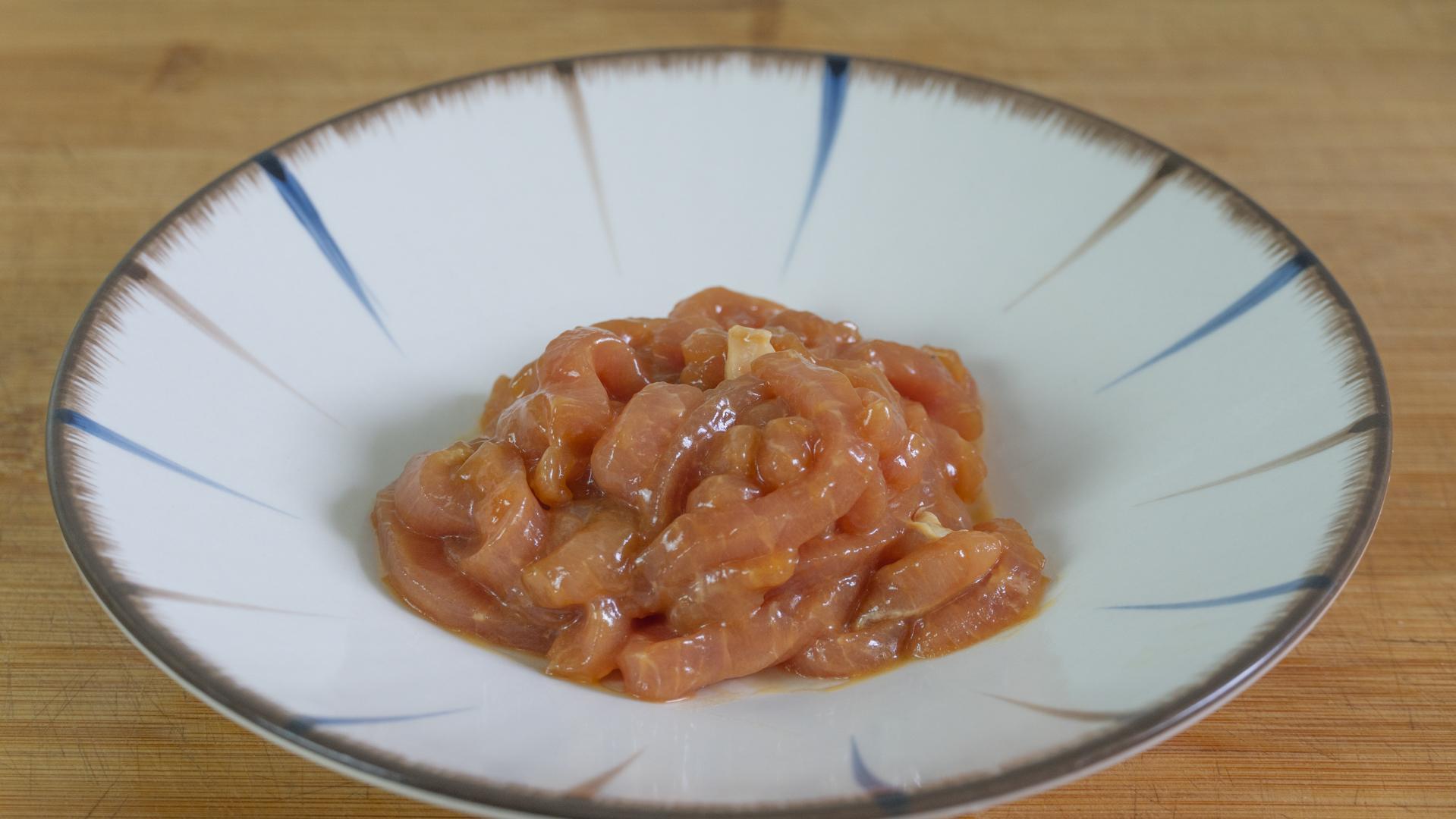 1、豬肉200克,用純瘦肉最好,先切成薄片,再切成肉絲,加鹽、生抽、料酒、澱粉、食用油、抓拌勻後醃製10分鐘,讓肉絲入個底味;