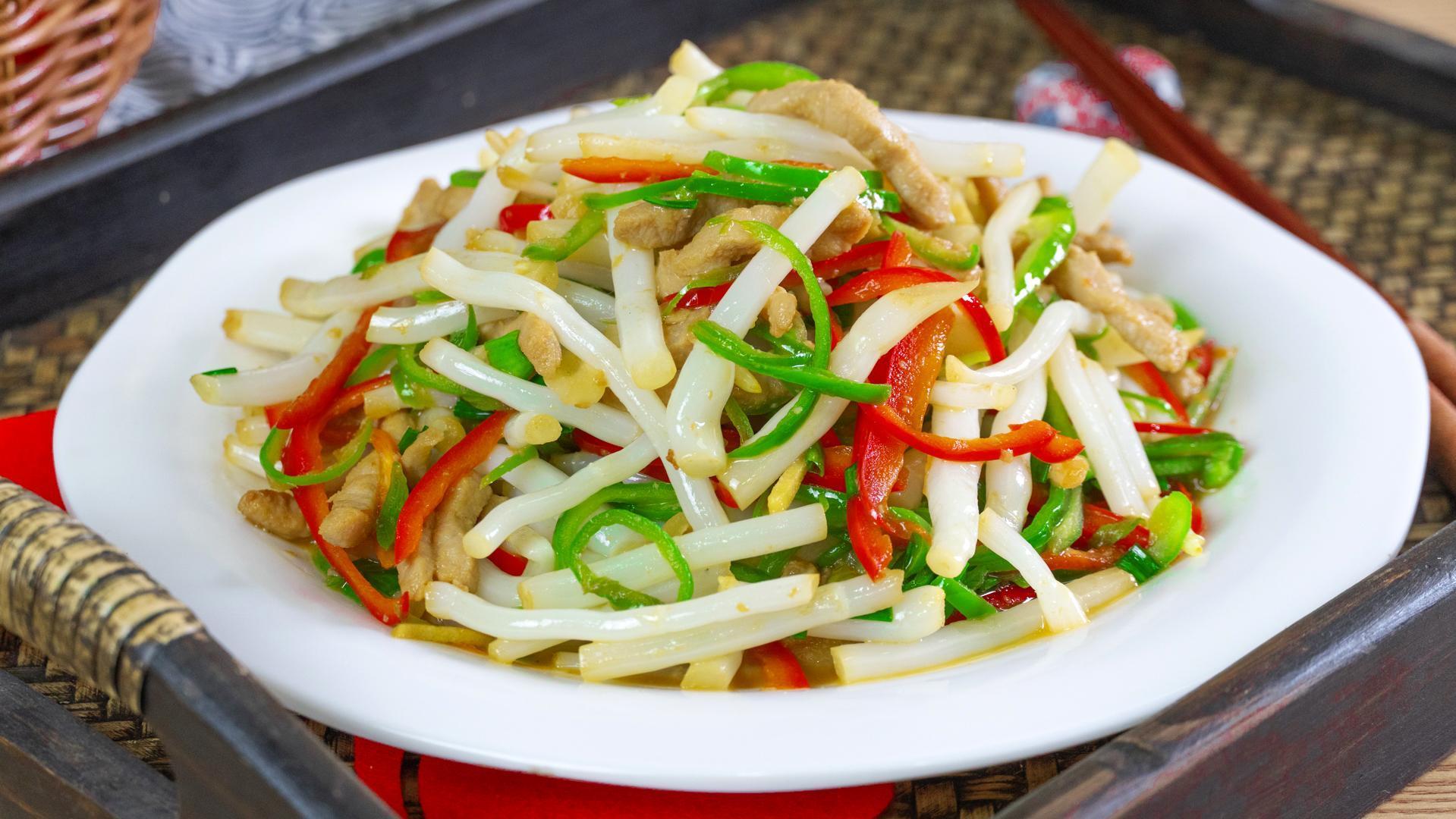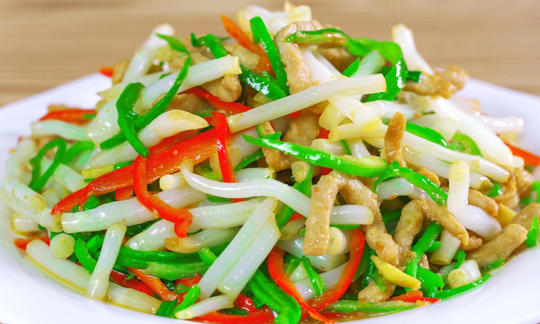 6、翻炒均勻入味兒後再撒一把小蔥花,好喫的銀條炒肉絲就做好了,一道清爽又美味的家常菜就完成了。