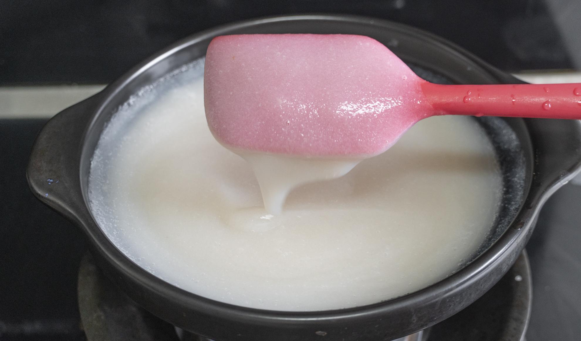 第五步:小火慢慢熬煮,避免糊鍋,邊煮邊攪拌,感覺到有點粘稠就可以,這個煮起來很快的,幾分鐘就能煮好。藕漿裏面是有大量的澱粉的,煮的時候容易鋪鍋,也容易粘底,所有小火慢慢的煮,而且邊煮邊攪拌呢是最好的。