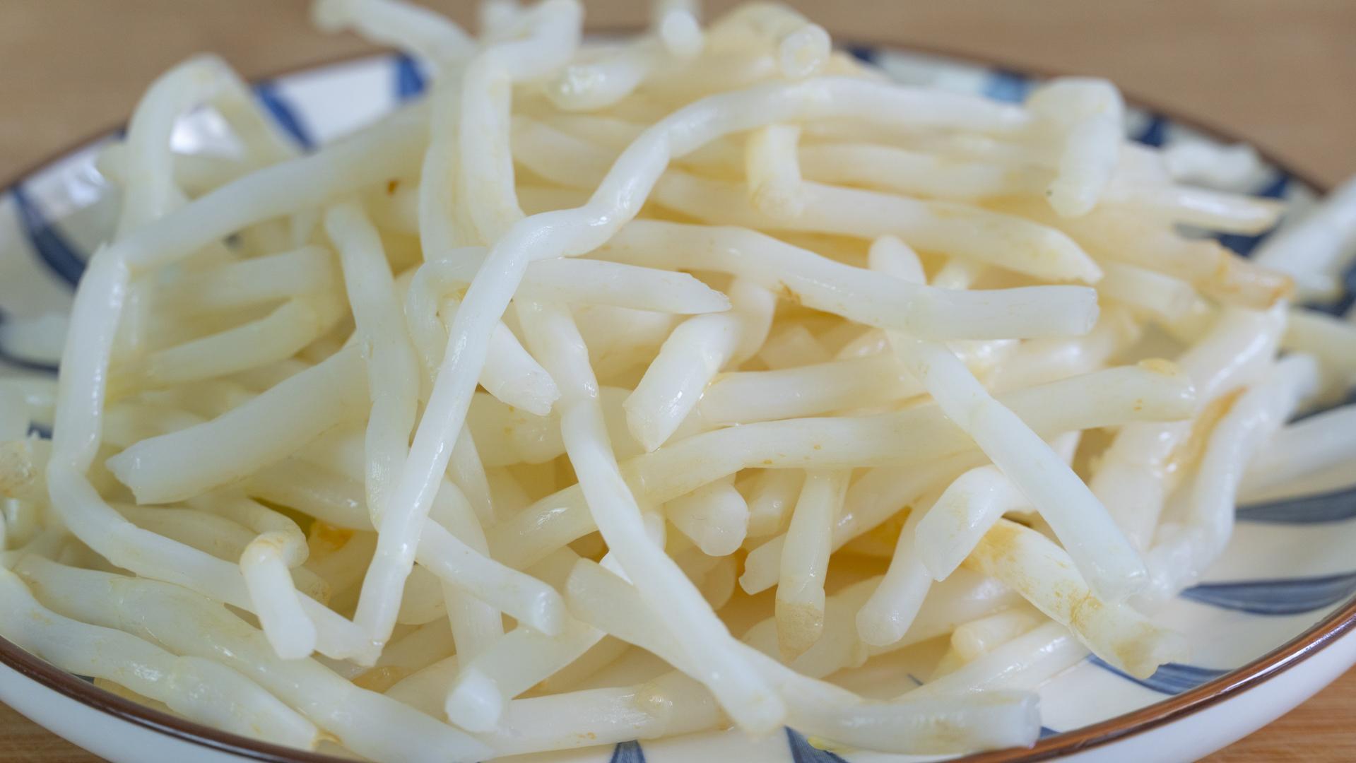 2、銀條500克,我用的醃製好的泡椒銀條,倒出來就可以了,不用清洗。如果是新鮮的銀條的話,就要洗乾淨去掉老莖,然後切成小段備用。
