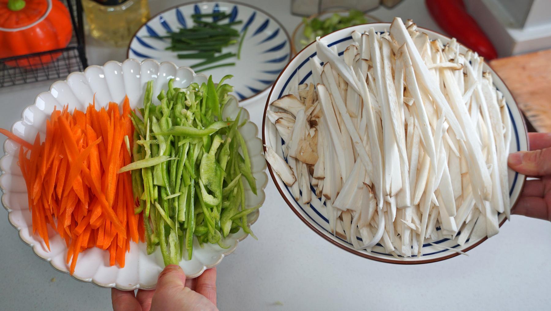 1、另外一個小炒我是用2個杏鮑菇搭配了1個胡蘿蔔和2個辣椒,切成絲了直接焯下水,撈出來把水先給它控一控;