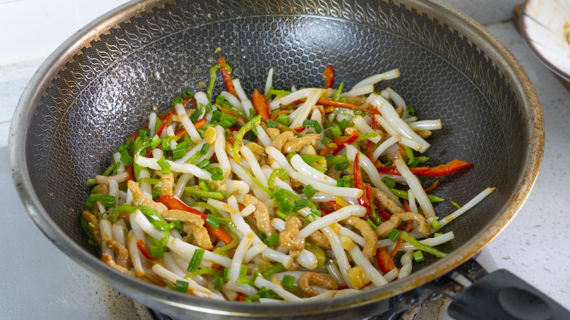 5、接着放入銀條,大火翻炒均勻後倒入青紅辣椒,然後加入適量的鹽、醬油、胡椒粉、雞精、糖調味。