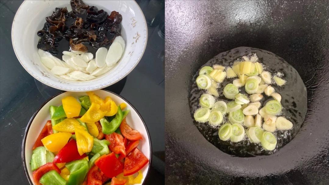 3、起鍋熱油、下蔥蒜爆香,倒入焯水過後的山藥和木耳菜椒。