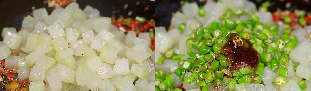 3、倒入冬瓜、青椒末、鹽、味精、生抽、蠔油開上大火翻炒均勻,炒至上色。