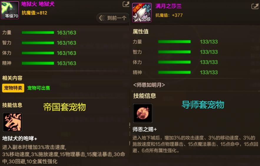 對比“導師套/夏日套寵物”,主要多了15點命中和4點屬強。
