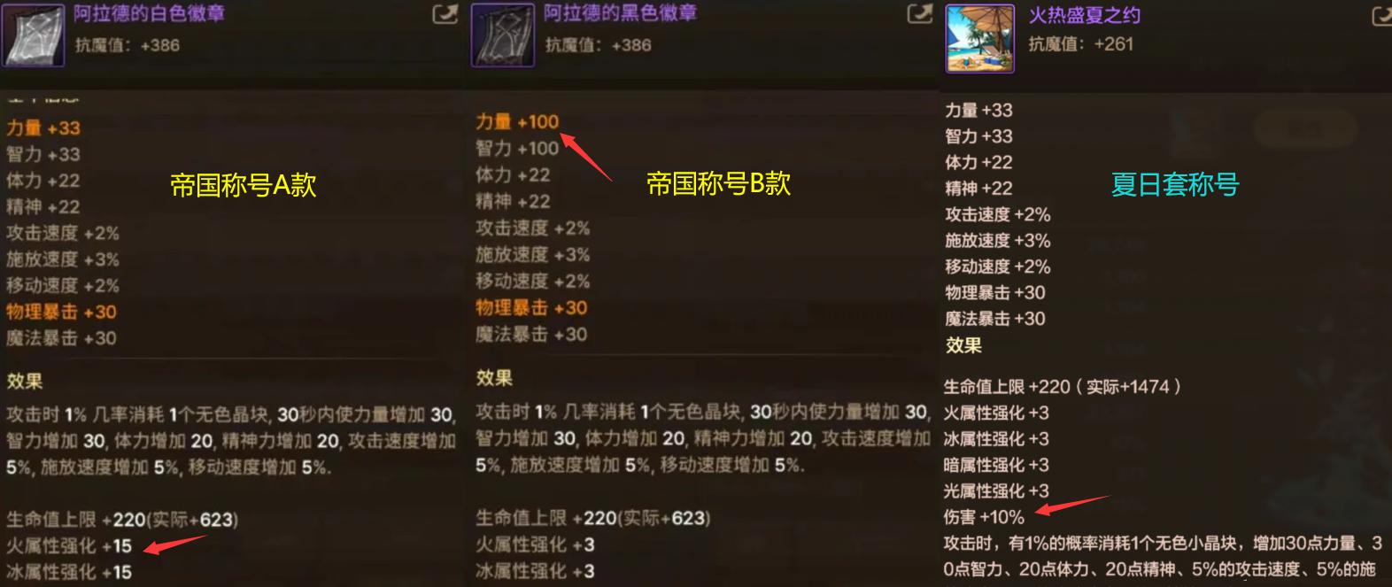 “帝國稱號”對比“導師套/夏日套稱號”,輸出職業多了12點全屬強,但是少了10%黃字,說實話並沒有提升,稱號部位就不用換啦。