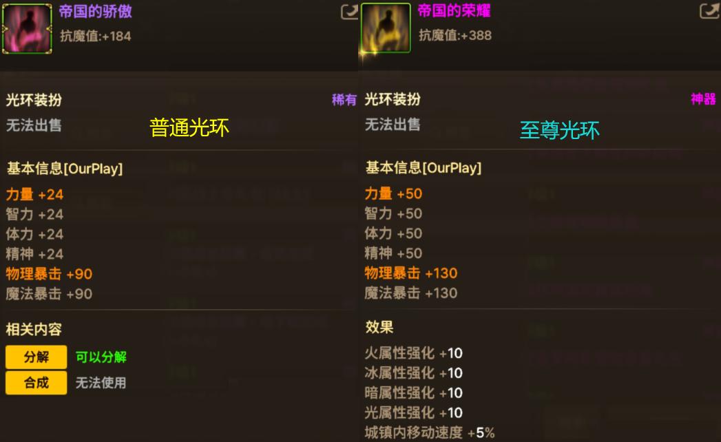 【至尊光環】對比“導師套/夏日套至尊光環”,多了30點暴擊、以及10點全屬強!