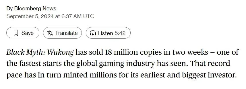 首先是大家最關心的銷量,根據報道所披露的信息:《黑神話:悟空》在兩週內賣出了1800萬份,這份數據是全球遊戲行業有史以來最好的開局之一,英雄互娛作爲遊戲科學最早且最大的投資企業也從中收穫了數百萬的收益。