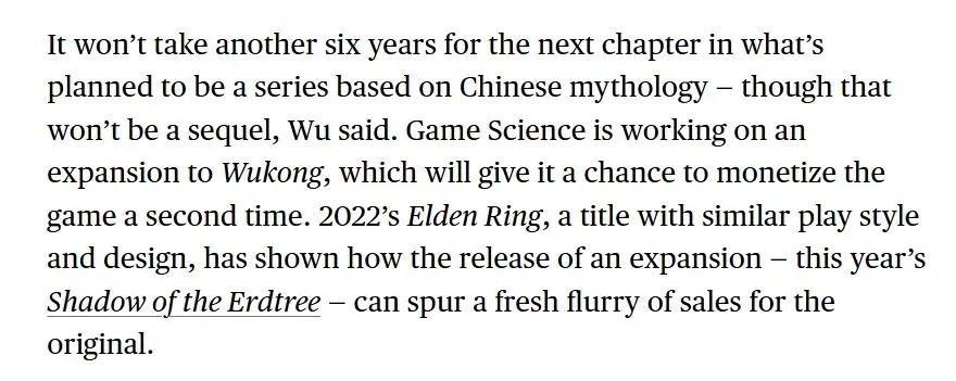 聊到《黑神話:悟空》的時候,吳旦向記者透露遊戲科學正在爲《黑神話:悟空》開發擴展內容,期望通過這些新內容,將遊戲銷量進一步推向3000萬份的目標——就像《黃金樹幽影》重新帶動《艾爾登法環》的銷售熱潮一樣。