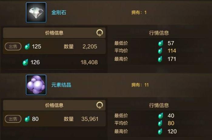 但實際上並不一樣,“金剛石”售價125泰拉,而“元素結晶”售價僅80泰拉,中間相差了45泰拉,如果買100個的話,那就相差了4500泰拉。