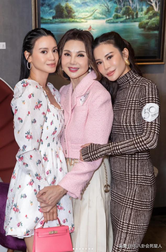活動上,母女三人同穿該品牌套裝,搭配當季限量款手包,站在中間穿粉色短外套的人正是已經68歲謝玲玲。