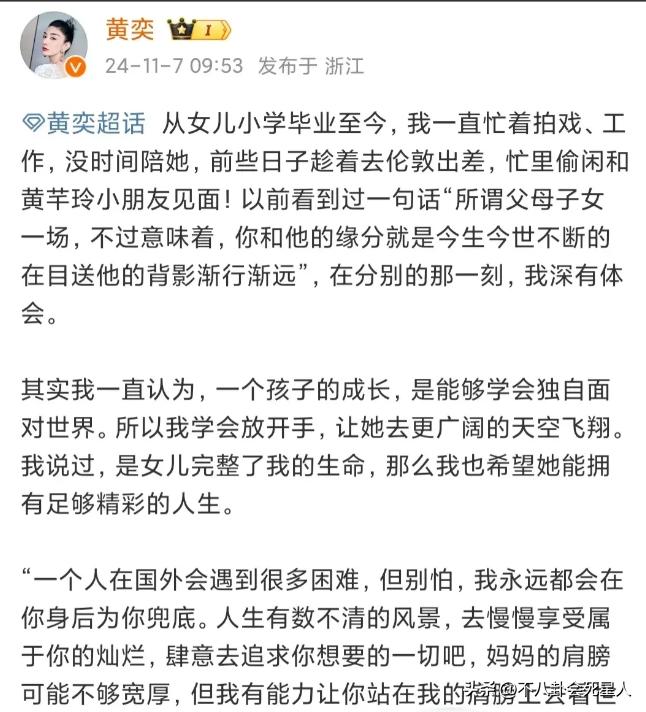 可能是女兒小小年紀就獨自出國留學,黃奕雖然忙於國內工作,但一有空就出國陪伴女兒。黃芊玲作爲黃奕目前唯一的女兒,看得出來黃奕十分疼愛這個女兒,社交平臺上也是滿滿關於女兒的思念。