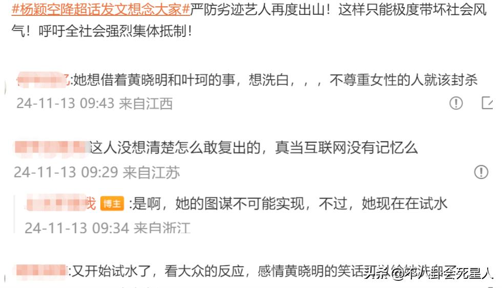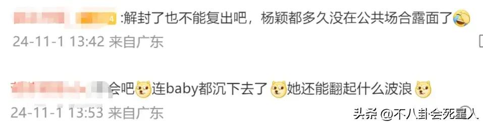 打開關於楊穎熱搜的評論區,不少網友都表示抵制楊穎的“復出”,更有網友把楊穎歸爲“劣跡藝人”,也有網友覺得楊穎這個舉動可能是因爲近期黃曉明和葉珂的事情,想趁機“洗白”,但不管怎麼樣,從評論區來看,支持楊穎“復出”的網友並不多。