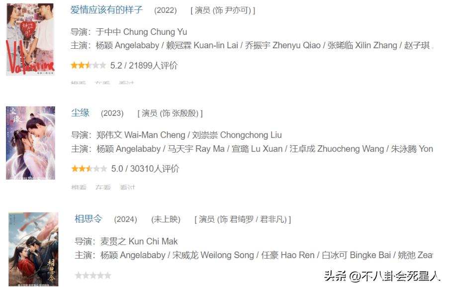 但說白了楊穎走的演員路線,一個演員說到底還是要看作品的,楊穎出演了不少作品但幾乎都是“爛片”,演技更是成爲了“內娛反面教材”,在和黃曉明離婚之後,楊穎的資源更是肉眼可見地下降了。