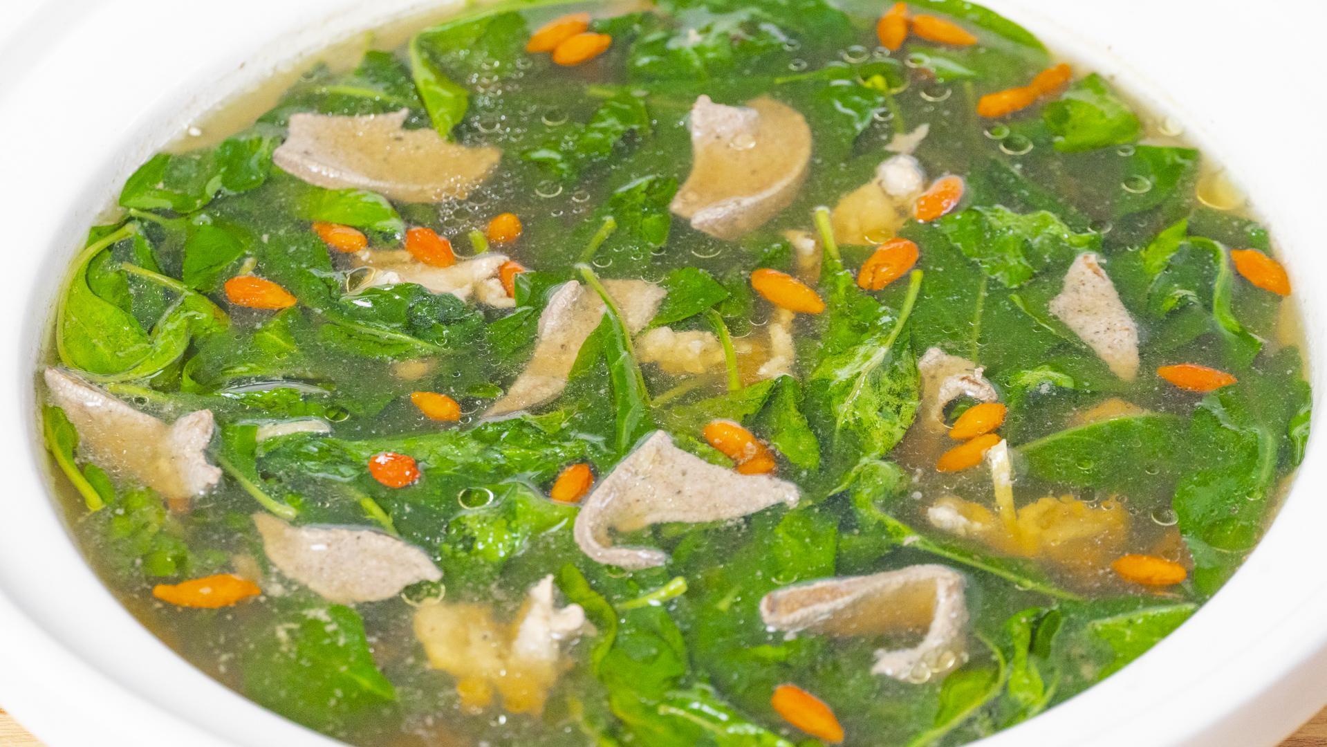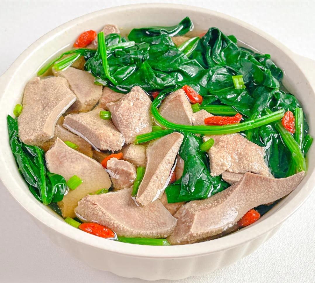 7、再加點薑片和料酒去腥,大火煮開,然後撇去浮沫,煮到肉片和豬肝都飄起來就熟了。接着加一勺食用油,一勺鹽調味,最後倒入枸杞葉子,大火繼續煮1-2分鐘。出鍋前加一把枸杞,可以關火出鍋了。