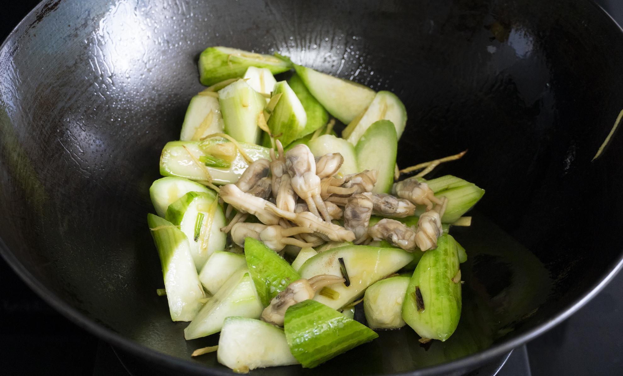 5、起鍋熱油,下蔥姜爆香,然後倒入絲瓜炒一炒,先把絲瓜炒軟,這樣喫起來會更香。絲瓜炒好後加一點鹽和胡椒粉,然後把蟶子肉倒進來一起炒兩下。