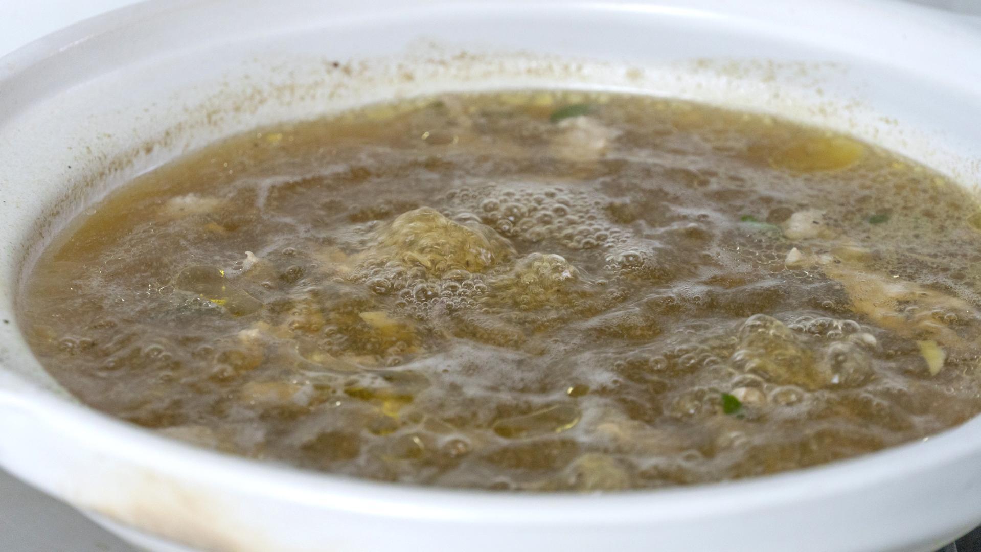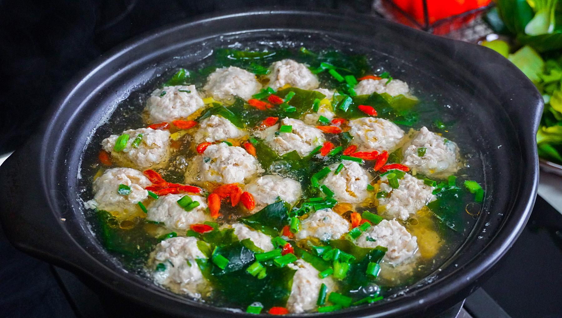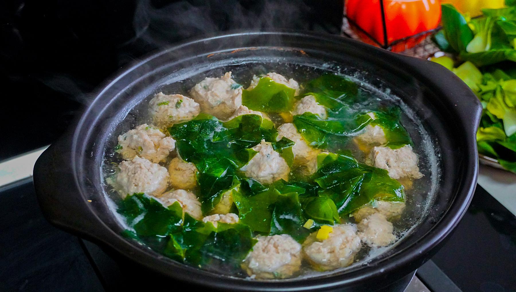 8、調味加點鹽、雞精、胡椒粉、香油,裙帶菜煮熟了就可以出鍋了,然後撒點蔥花和枸杞,裙帶菜丸子湯就做好了。