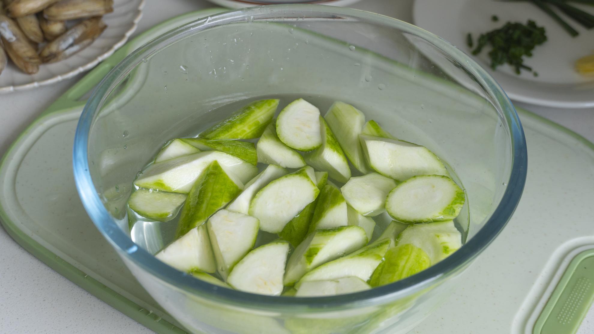 1、絲瓜一條,削皮滾刀塊。放入大碗裏,加一勺鹽後加水泡着,避免氧化變黑,或者你也可以最後再來切絲瓜。