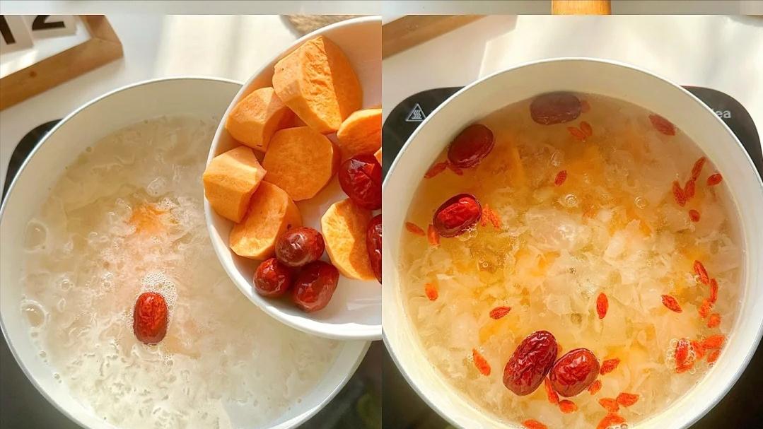 4、接着倒入紅薯和紅棗,再繼續煮20分鐘。