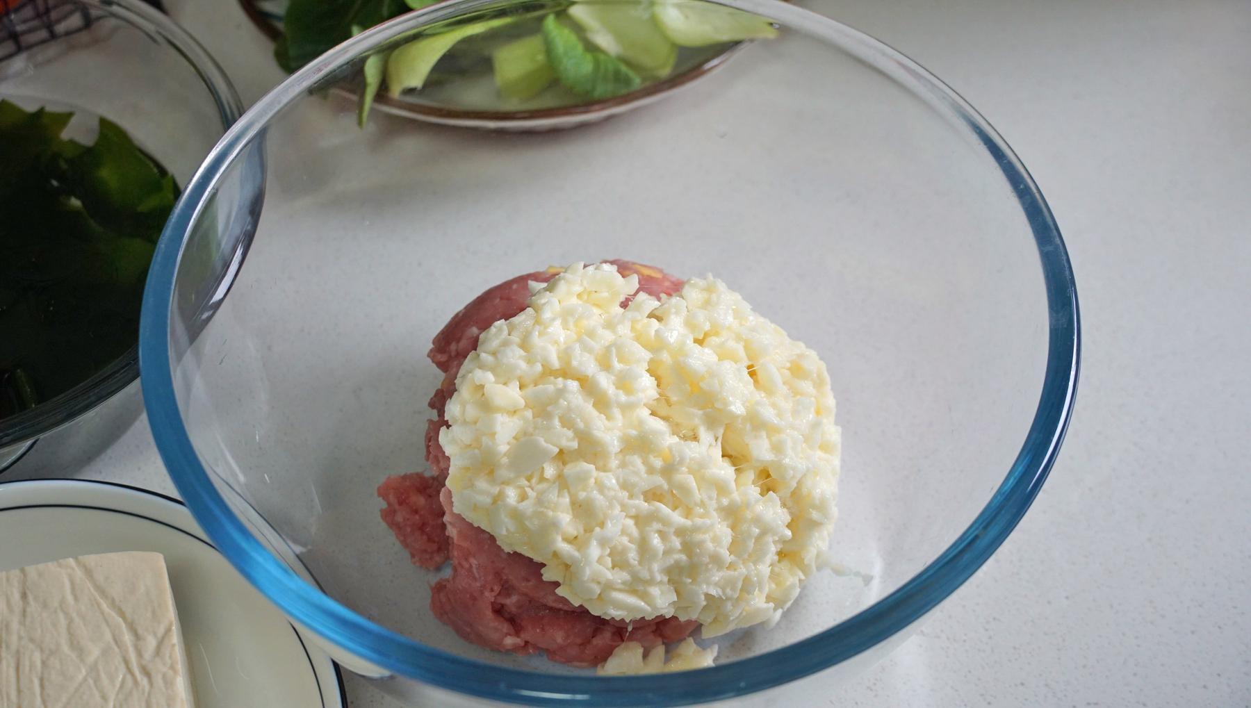1、豬腿肉半斤,洗淨去皮,手工剁成肉餡兒。