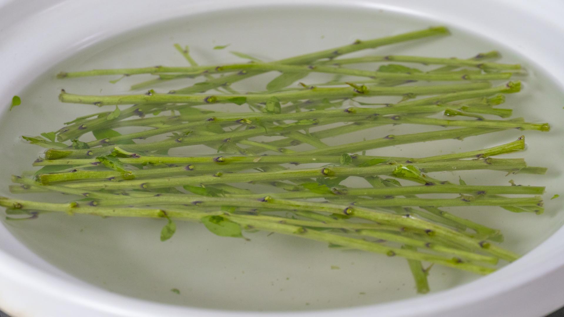 1、枸杞葉一把,先把葉子摘下來,梗子也不要扔掉,可以用來煮湯。把葉子用流動的清水沖洗幾遍,然後瀝乾水分備用,梗子也沖洗一下。
