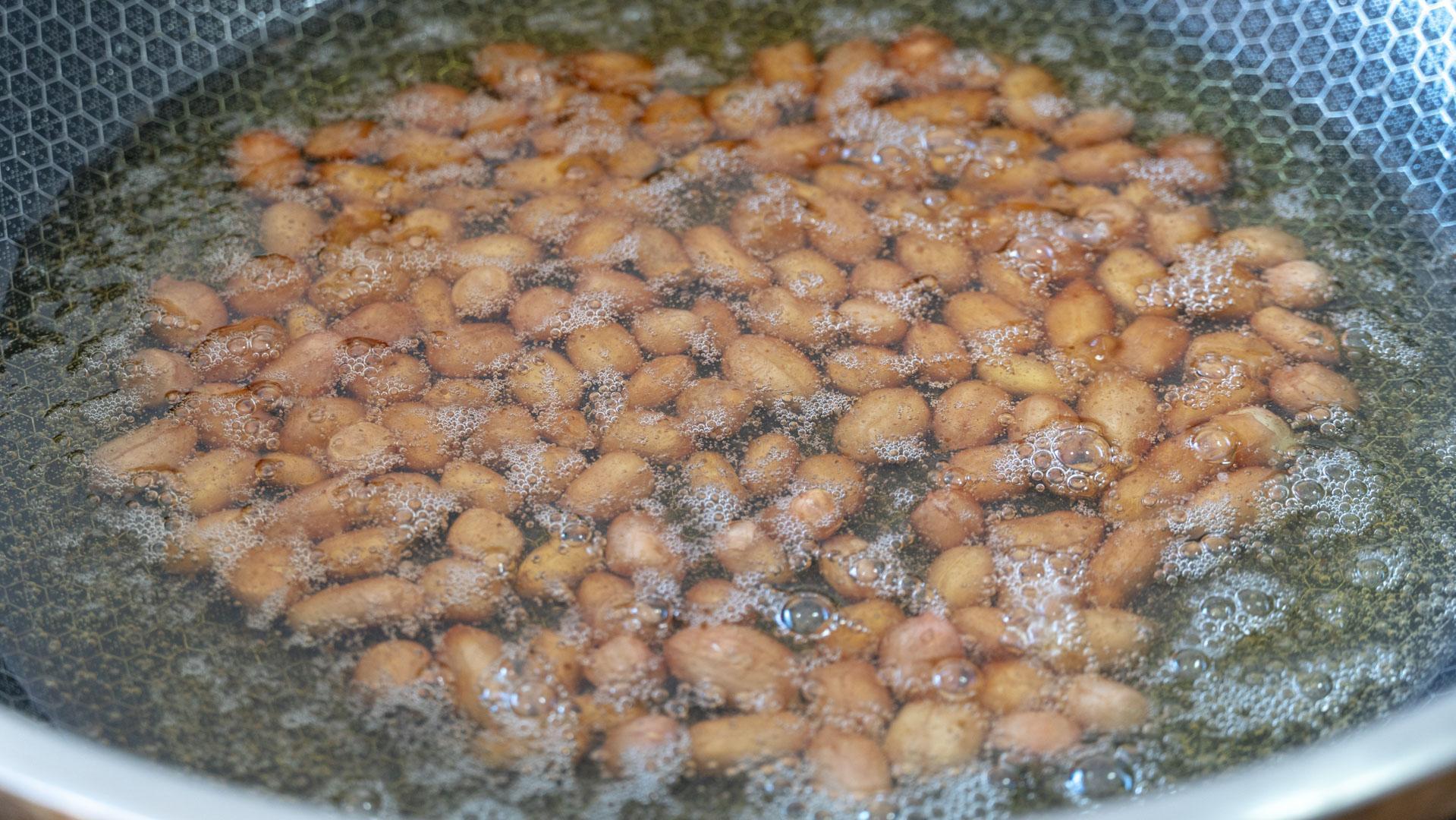 2、起鍋倒油,涼油下花生米炸,小火慢慢地炸熟,然後撈出。